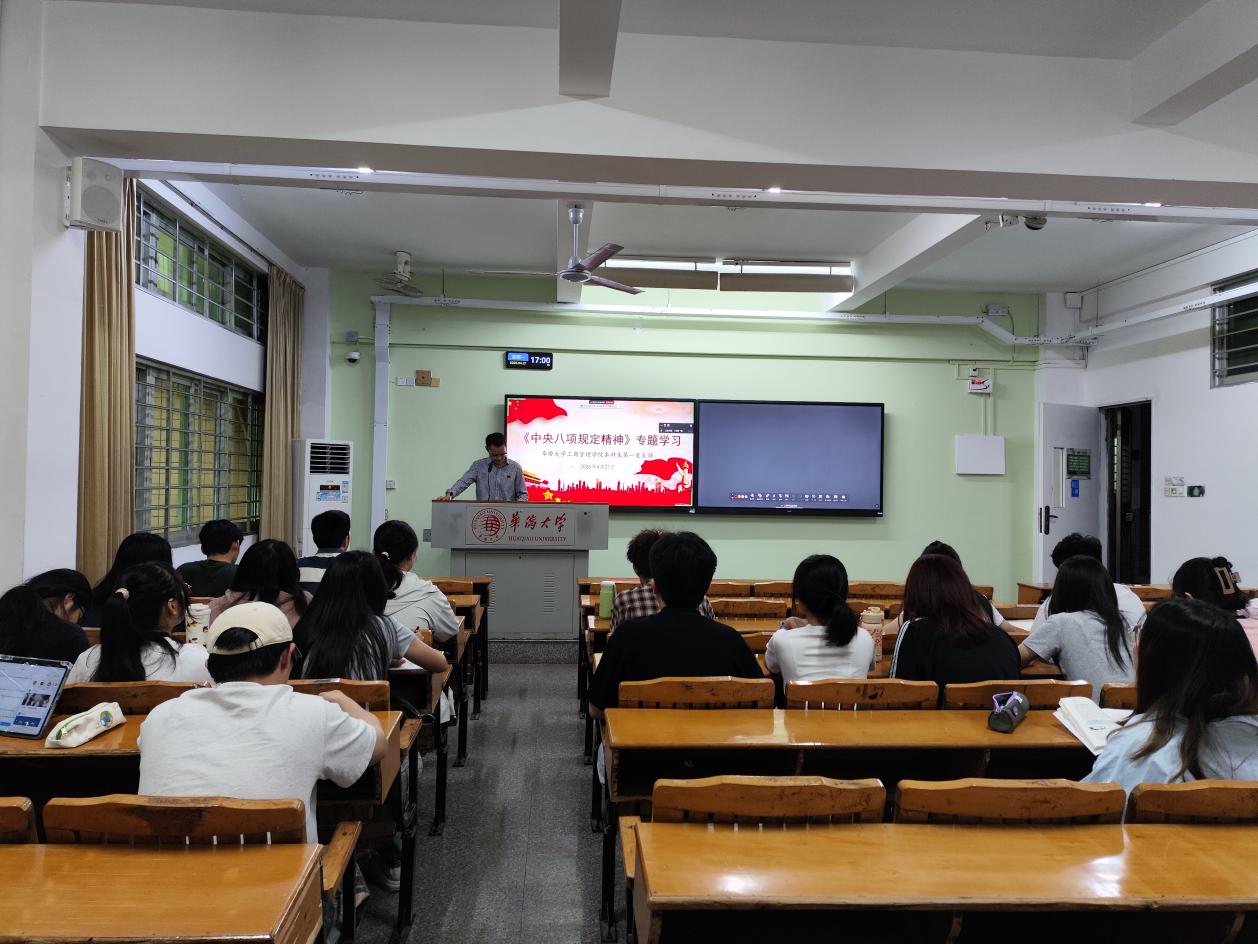 4月21日,永利集团304am登录本科生第一党支部开展“深入贯彻中央八项规定精神学习教育”专题党课,支部书记彭波主讲,全体学生党员参加。