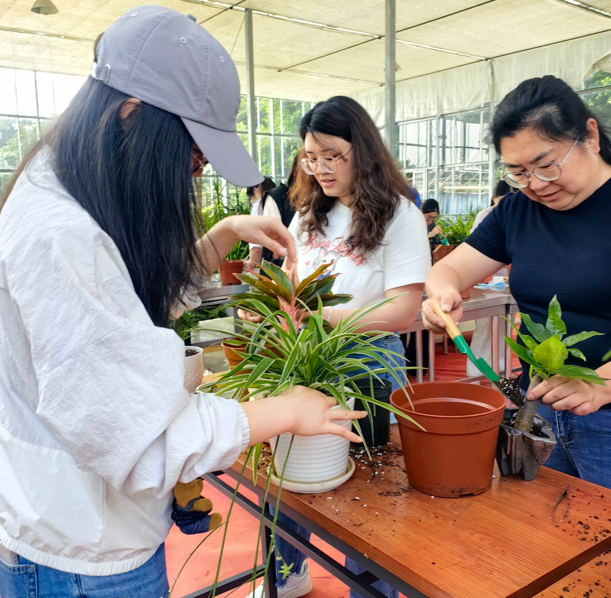 在实践环节,师生们一同拿起工具,挑选心仪的盆栽与花盆进行移植栽种,还用小彩石为盆栽打造专属 “小天地”。一盆盆绿植在师生手中逐渐成型,汗水浸润的不仅是土壤,更是大家对 “劳动创造美” 的切身体悟。过程中,老师与同学们围绕自己的盆栽热烈交流,师生之间其乐融融。在场的园艺工作者也在一旁给出建议与指导,为师生们的盆栽创作提供了专业的支持。